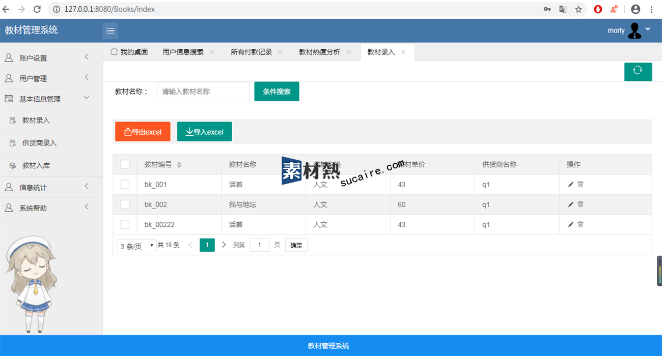 项目描述:管理员可以增删改查教材、教材商、入库教材、用户(用户包括学生和教师)可以对教材商、教材进行excel的导入导出操作,教师可以领取入库的教材,可以退还教材,学生只能在对应的教师那里领取教材,并且可以退还教材、查询自己已经领取的教材,并且对已领教材付款。