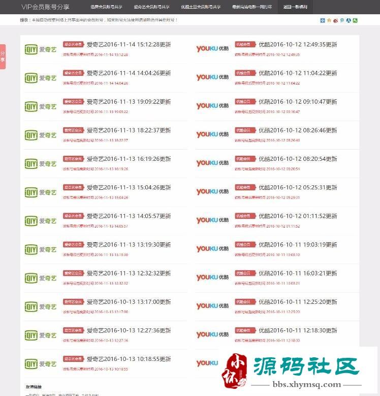 影视VIP账号资源分享网站PHP源码_爱奇艺优酷迅雷账号分享网站,全自动采集发布 迅雷优酷爱奇艺账号分享,自带自动采集帐号共享,无需人工更新内容程序使用PHP+Mysql+Tinkphp 最新 优化了些小细节,去掉自带的广告,附教程