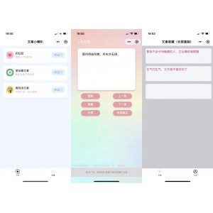 此文案小程序主要功能为分享各种有趣幽默的文案免服务器免域名,源码只提供彩虹屁,朋友圈,毒鸡汤API接口,其他需自行查找替代小程序拥有复制收藏功能,可自行体验设置流量主可自行查看代码进行更换id截图演示: