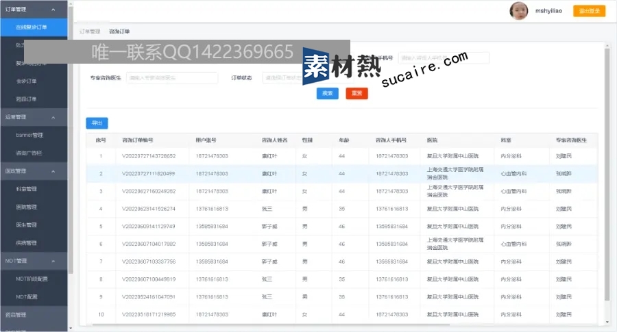 订单管理:在线复诊订单 复诊购药订单 会诊订单 药品订单