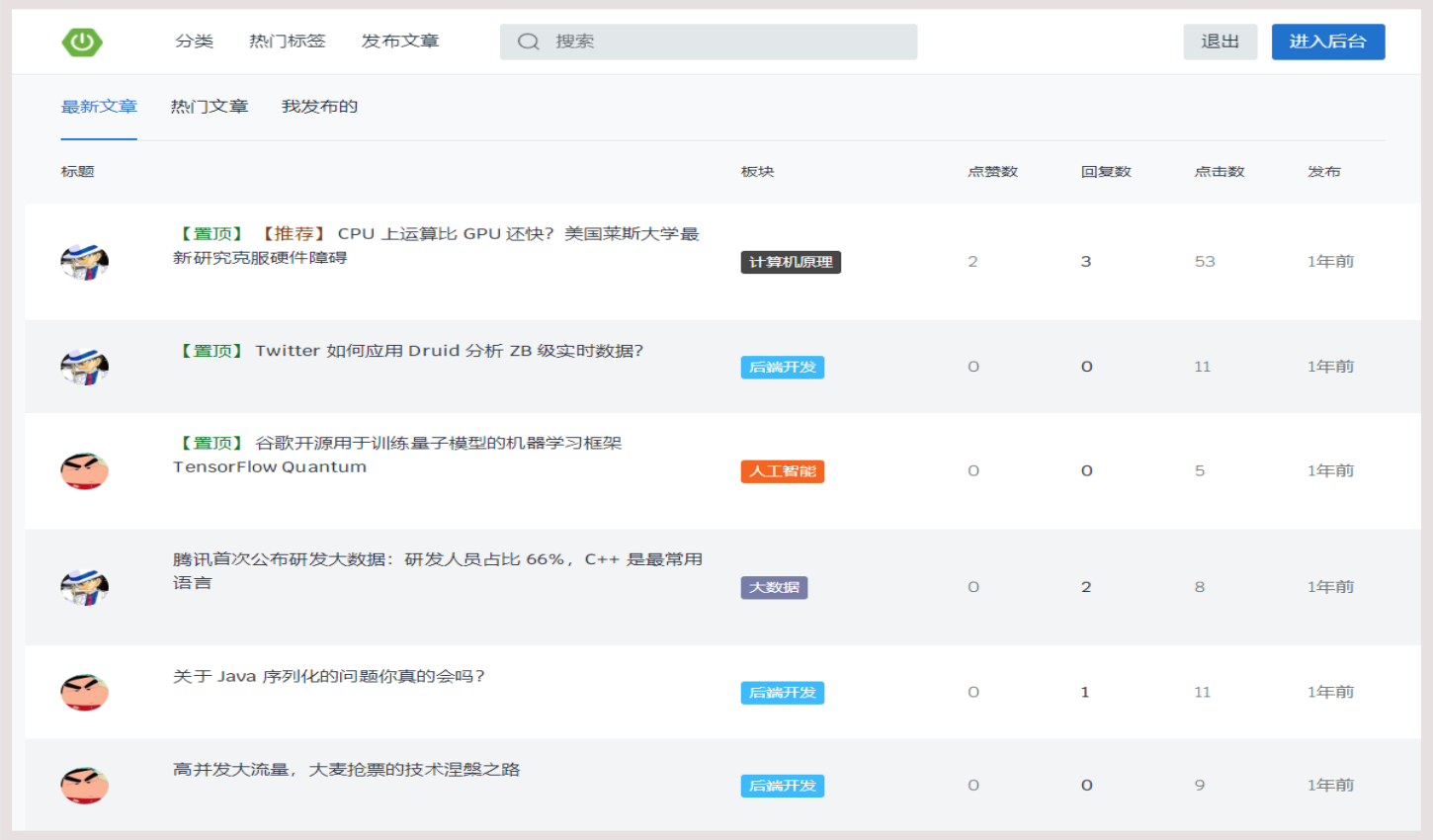 点赞评论回复文章等 管理员可以对整个系统用户管理,文章管理,分类管理,角色权限管理,评论管理等等