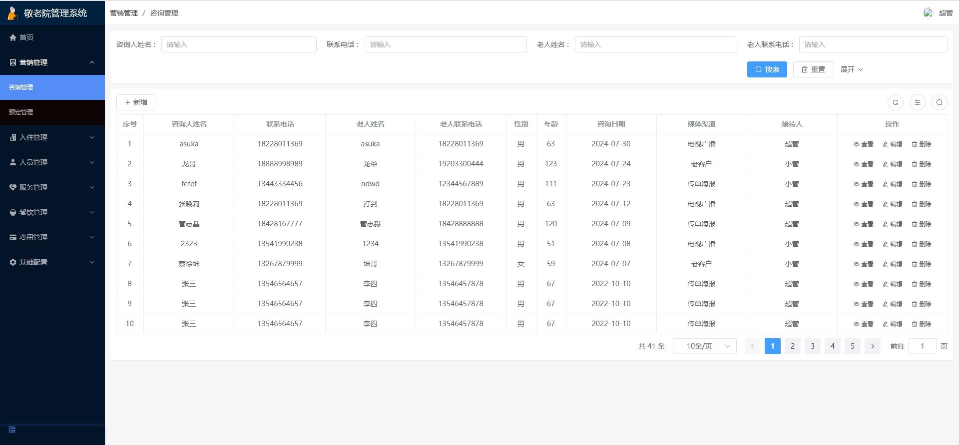 2、咨询管理、预定管理、床位全景、入住签约、外出登记、来访登记、事故登记、退住申请、长者档案、员工管理、服务项目、护理等级、服务预定、菜品管理、餐饮套餐、点餐、预存充值、消费记录、退住审核、房间类型、楼栋管理