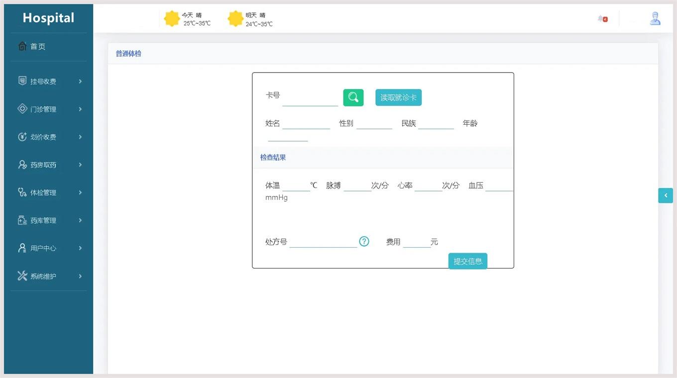 普通体检:卡号(急诊卡读取)检查结果、体温、脉搏、心率、血压
